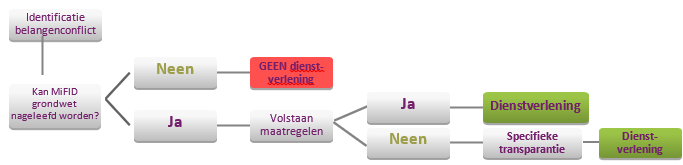 De wettelijke regeling omtrent belangenconflicten is een aanvulling op de algemene MiFID-grondwet. Deze grondwet wordt door ons kantoor geëerbiedigd door zich loyaal, billijk en professioneel in te zetten voor de belangen van de klant bij het verlenen van diensten van verzekeringsbemiddeling.